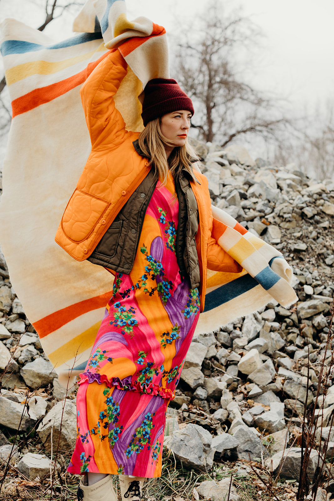 Neon orange goes with anything, really. This flight jacket is perfect for layering under a heavy coat in winter or wearing along in the spring and fall.